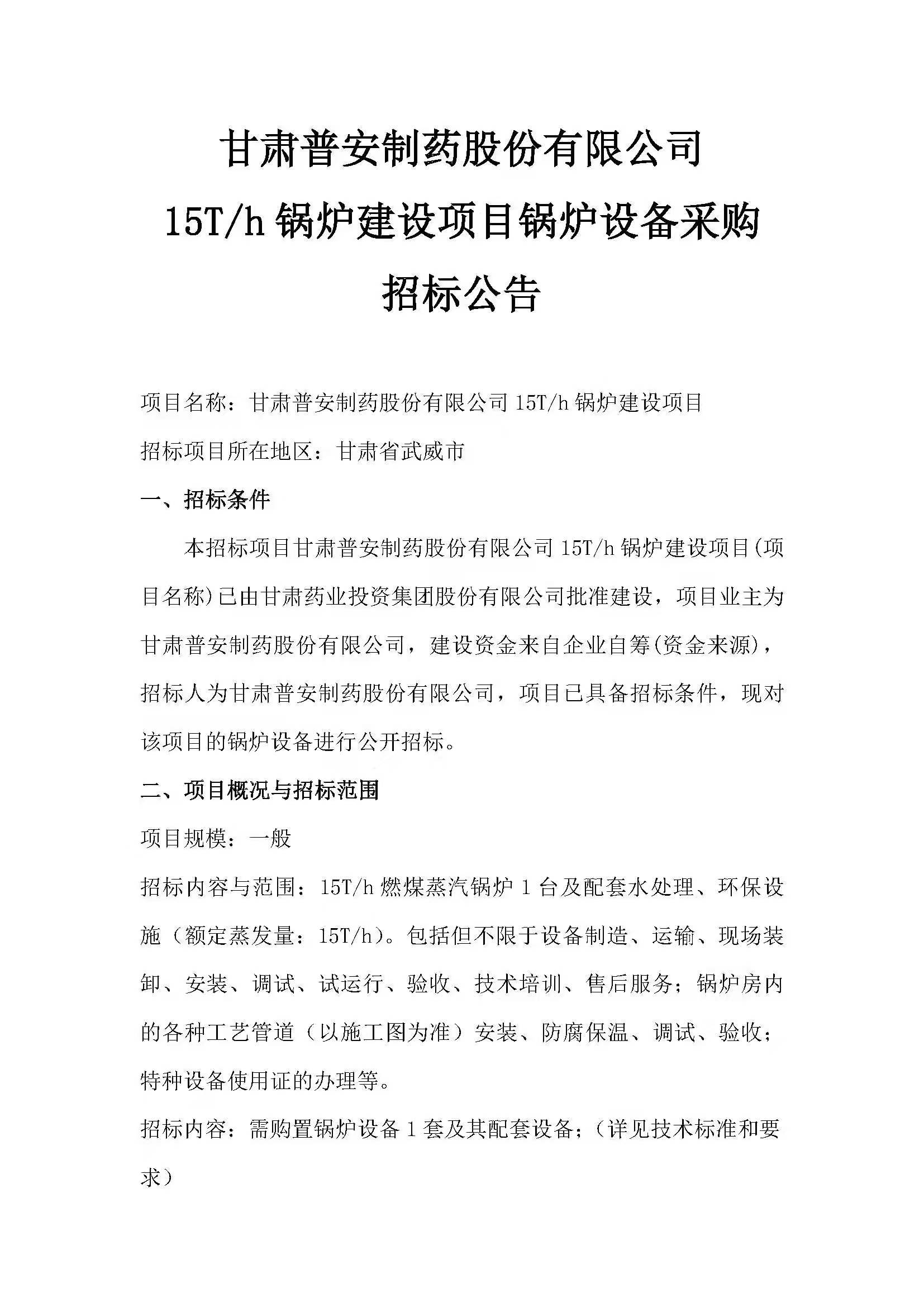 甘肅普安制藥股份有限公司15T/h鍋爐建設項目鍋爐設備采購招標公告