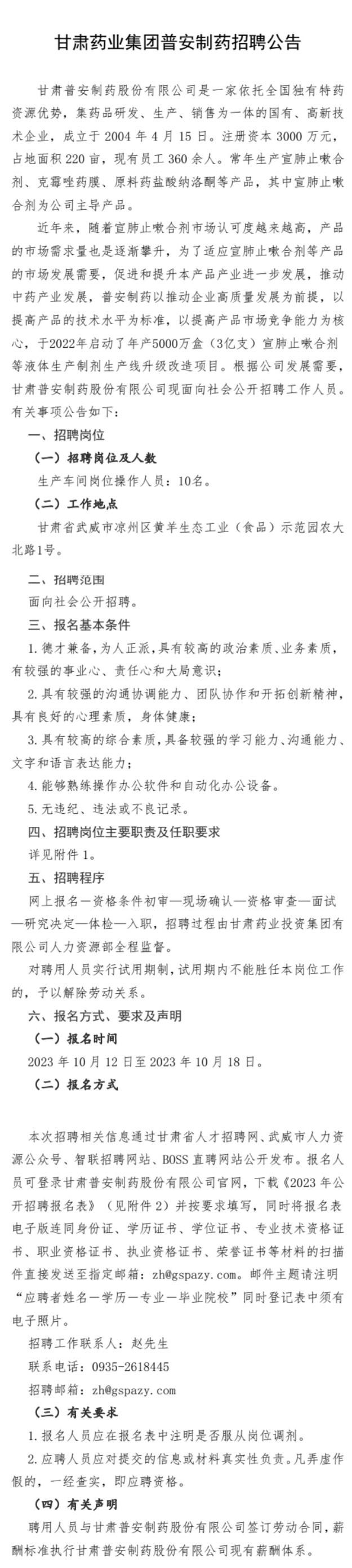 甘肅藥業集團普安制藥招聘公告
