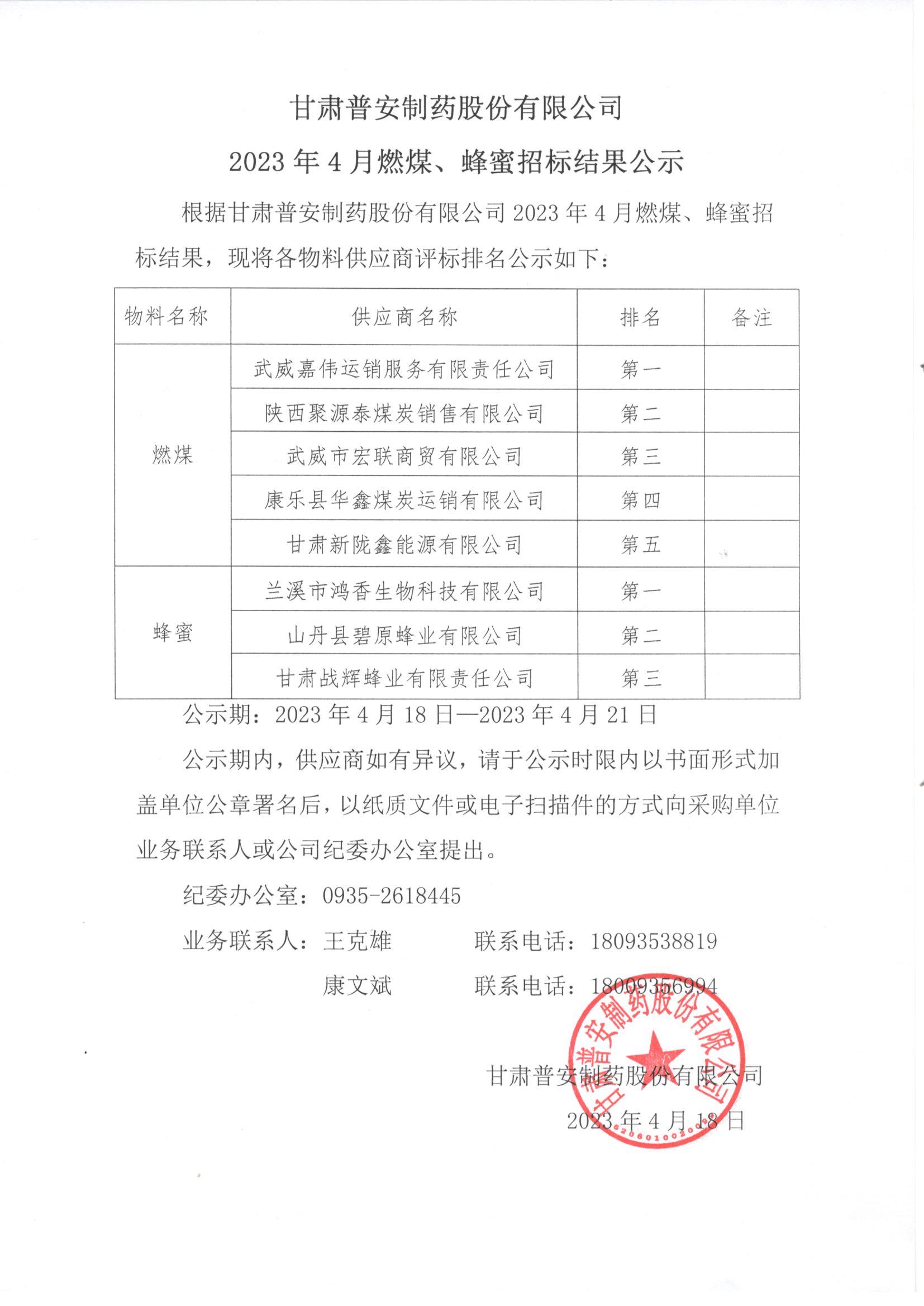 甘肅普安制藥股份有限公司2023年4月燃煤、蜂蜜招標結(jié)果公示