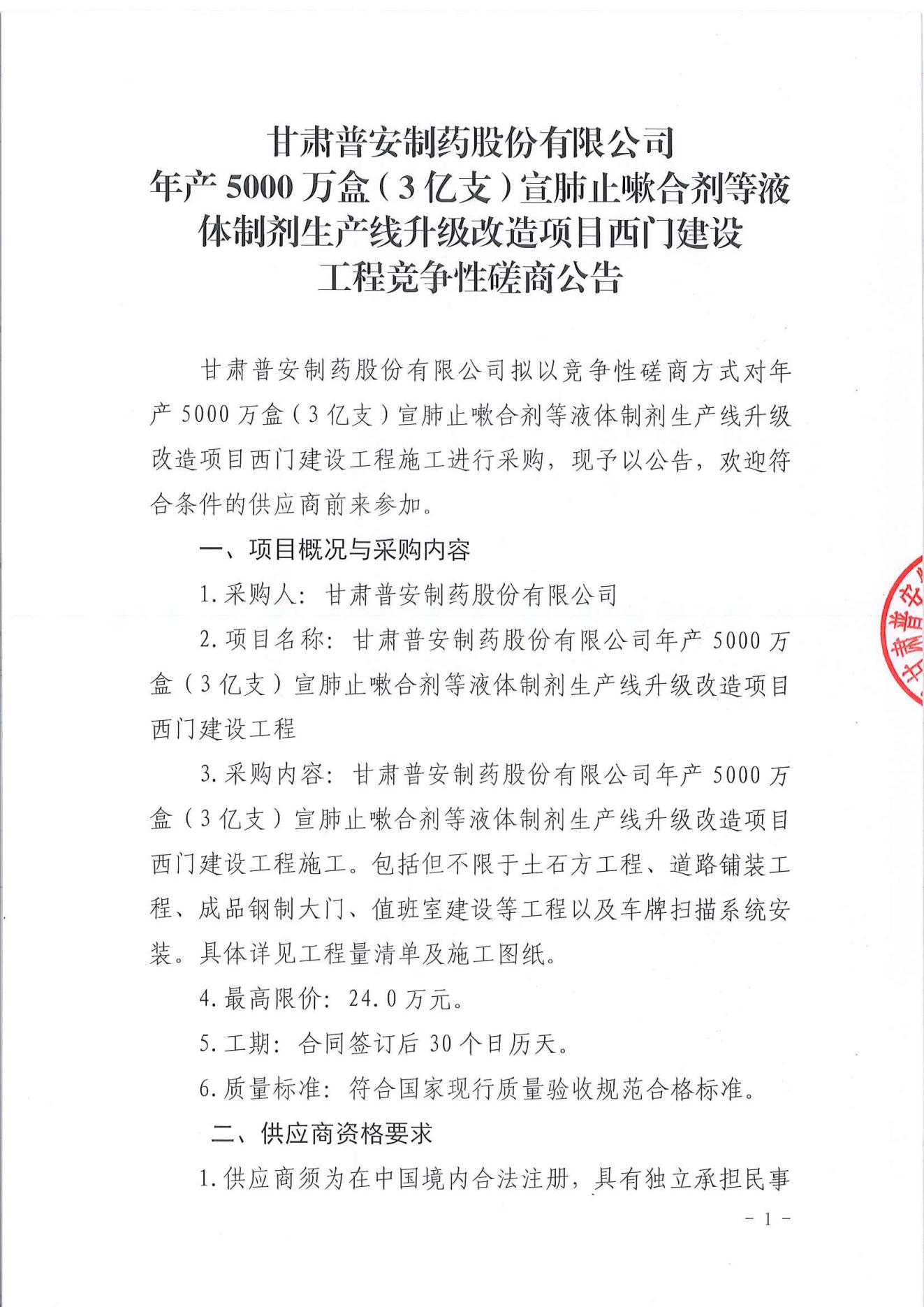 甘肅普安制藥股份有限公司年產5000萬盒(3億支)宣肺止嗽合劑等液體制劑生產線升級改造項目西門建設工程競爭性磋商公告