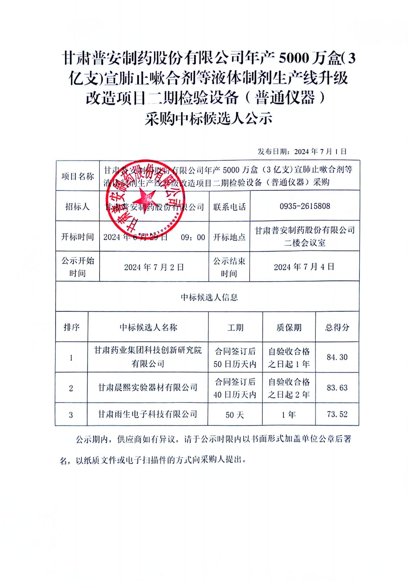 甘肅普安制藥股份有限公司年產5000萬盒(3億支)宣肺止嗽合劑等液體制劑生產線升級改造項目二期檢驗設備(普通儀器)采購中標候選人公示